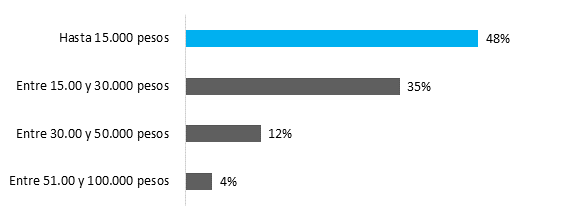 Por otra parte, al ser consultados acerca de sus ingresos mensuales, hicimos especial hincapié en referirnos al dinero con el que cuenta mensualmente para sus gastos generales, expresado en pesos argentinos. Y como ejemplo propusimos “lo que le queda en mano del recibo de sueldo; lo que gana de su facturación tras pagar sus obligaciones”. El 48% vive con $15.000 o menos, el 35,13% entre 15 y 30 mil pesos, entre 30 y 50 mil el 12,38% y con más de ese número el 4,4%.
