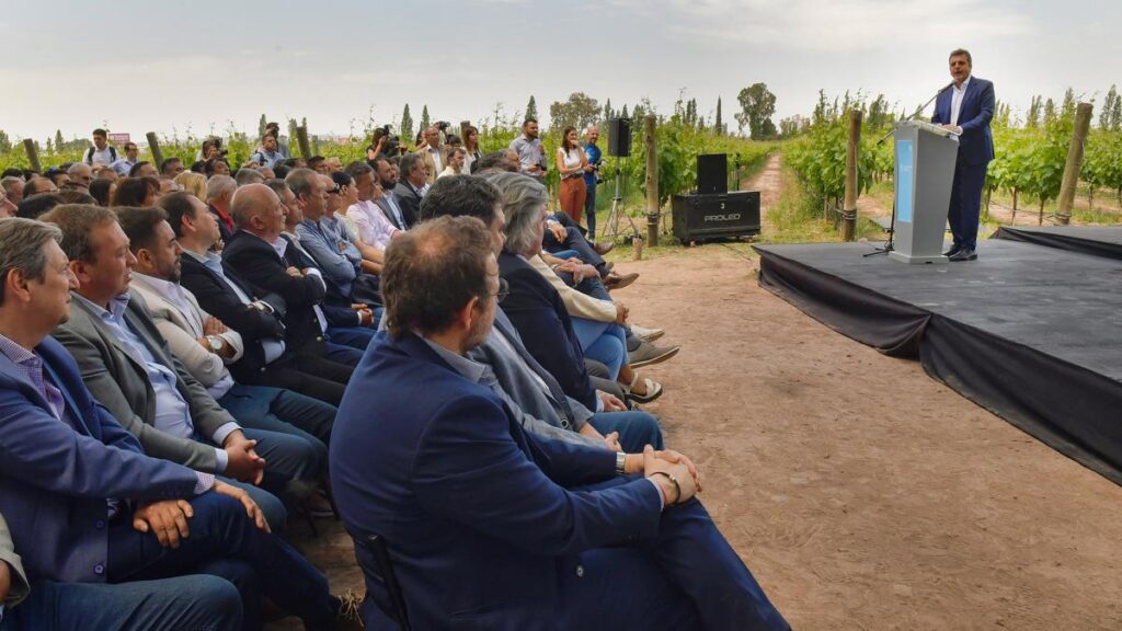 El jefe del Palacio de Hacienda lanzó el plan de protección para economías regionales en un acto que compartió, entre otros, con el gobernador de Mendoza, Rodolfo Suarez; la senadora nacional, Anabel Fernández Sagasti; el secretario de Coordinación Federal y Operativa Agropecuaria, Jorge Solmi; y el presidente del Instituto Nacional de Tecnología Agropecuaria (INTA), Mariano Garmendia.