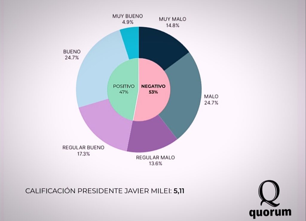 La evaluación del Presidente Javier Milei fue REGULAR, un tercio de los encuestados calificó entre 5 a 6 al anarco-libertario. Si se tratará del boletín escolar no llegó a promediar el seis que le permita aprobar. El piso que obtuvo en las primarias presidenciales del 2023 parece consolidado, pero el techo de adhesiones no perfora el 50% en el estudio.